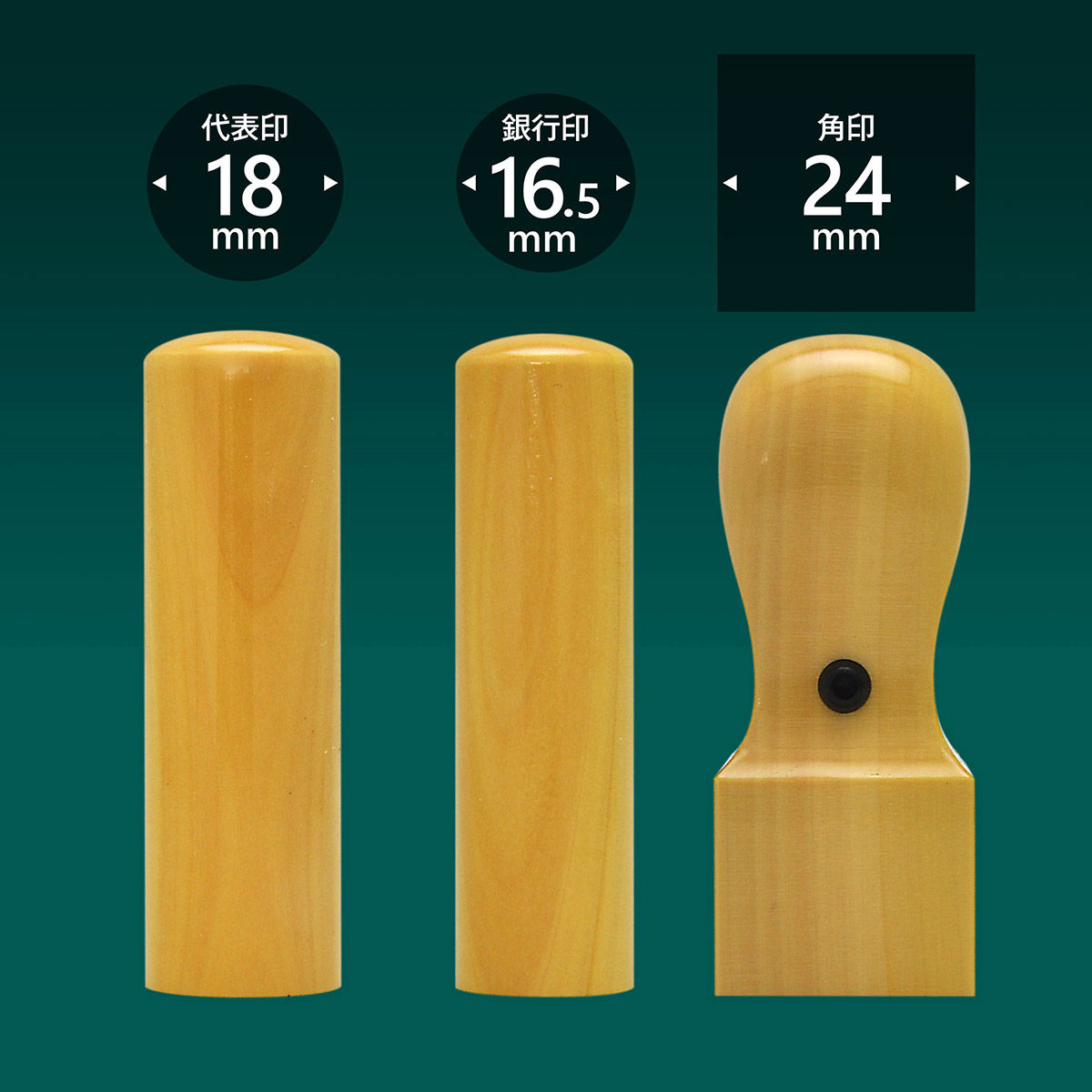 代表印丸寸胴18ミリ・銀行印丸寸胴16.5ミリ・角印角天丸24ミリの3本セットです。