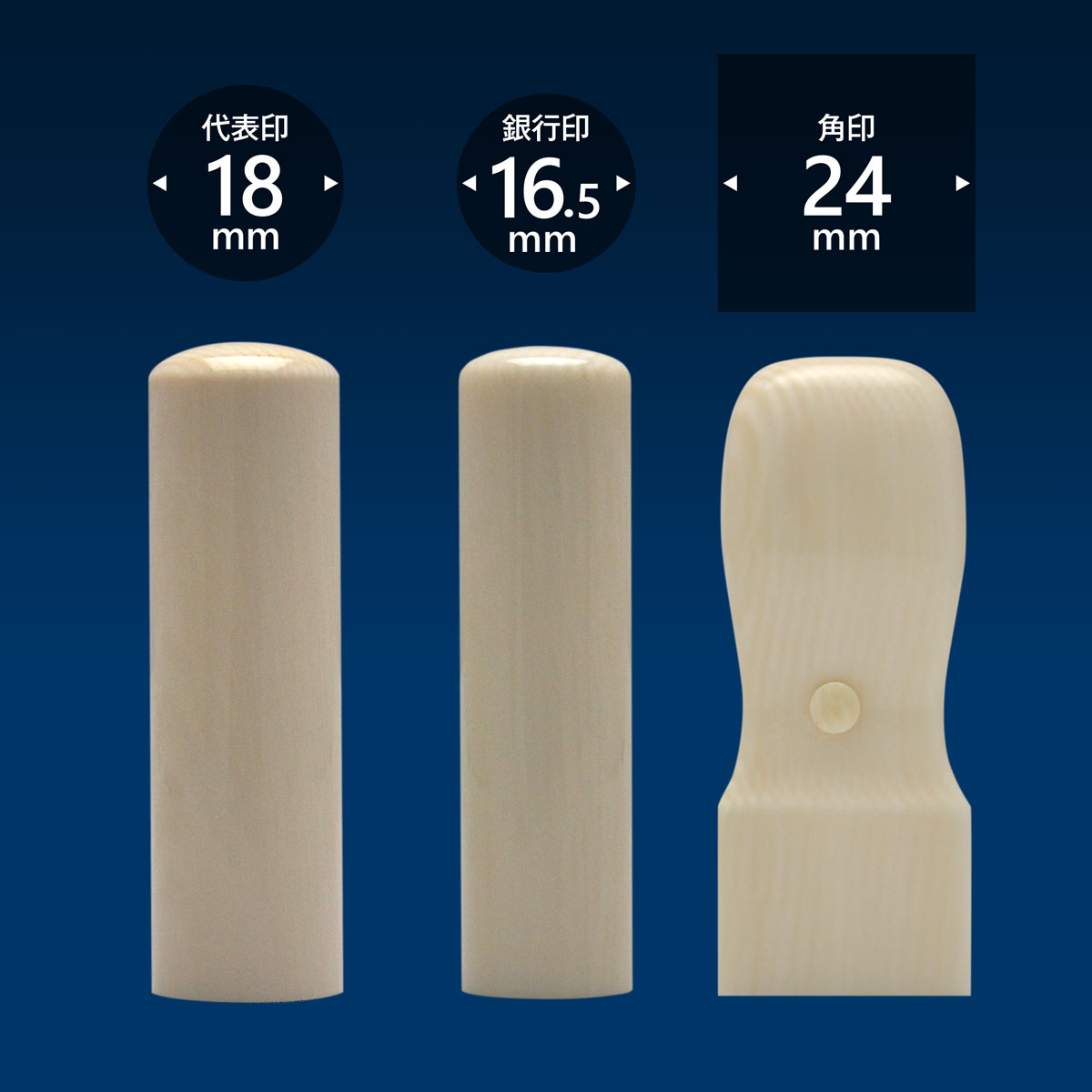 代表印丸寸胴18ミリ・銀行印丸寸胴16.5ミリ・角印角天丸24ミリの3本セットです。