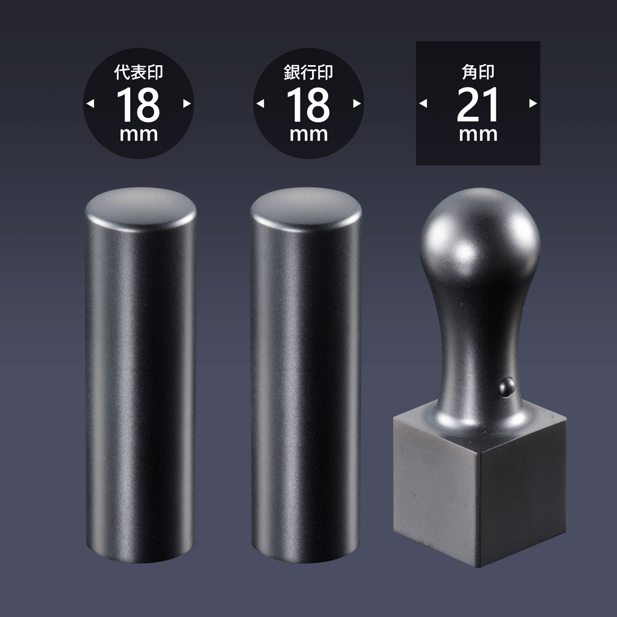代表印丸寸胴18ミリ・銀行印丸寸胴18ミリ・角印角天丸21ミリの3本セットです。