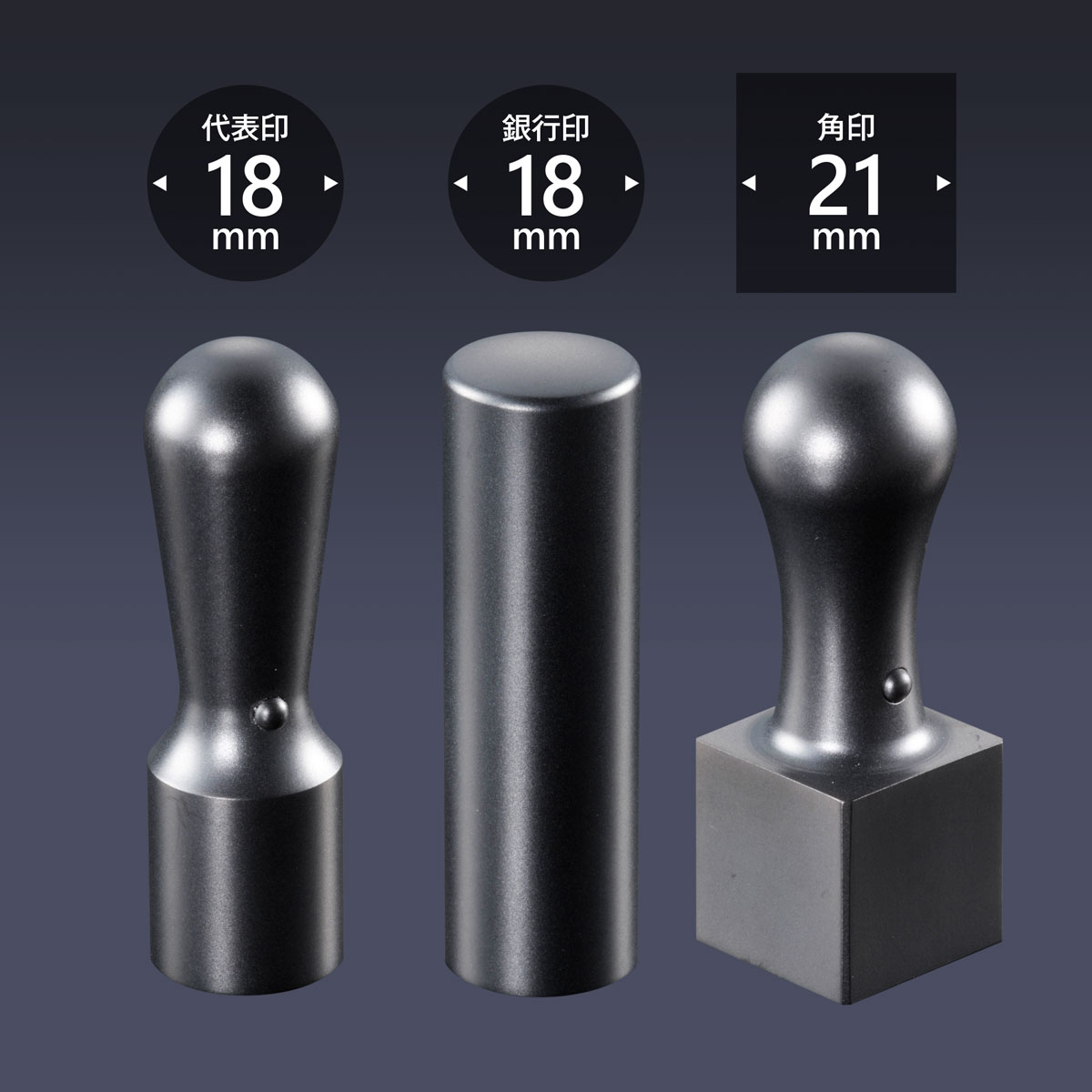 代表印丸天丸18ミリ・銀行印丸寸胴18ミリ・角印角天丸21ミリの3本セットです。