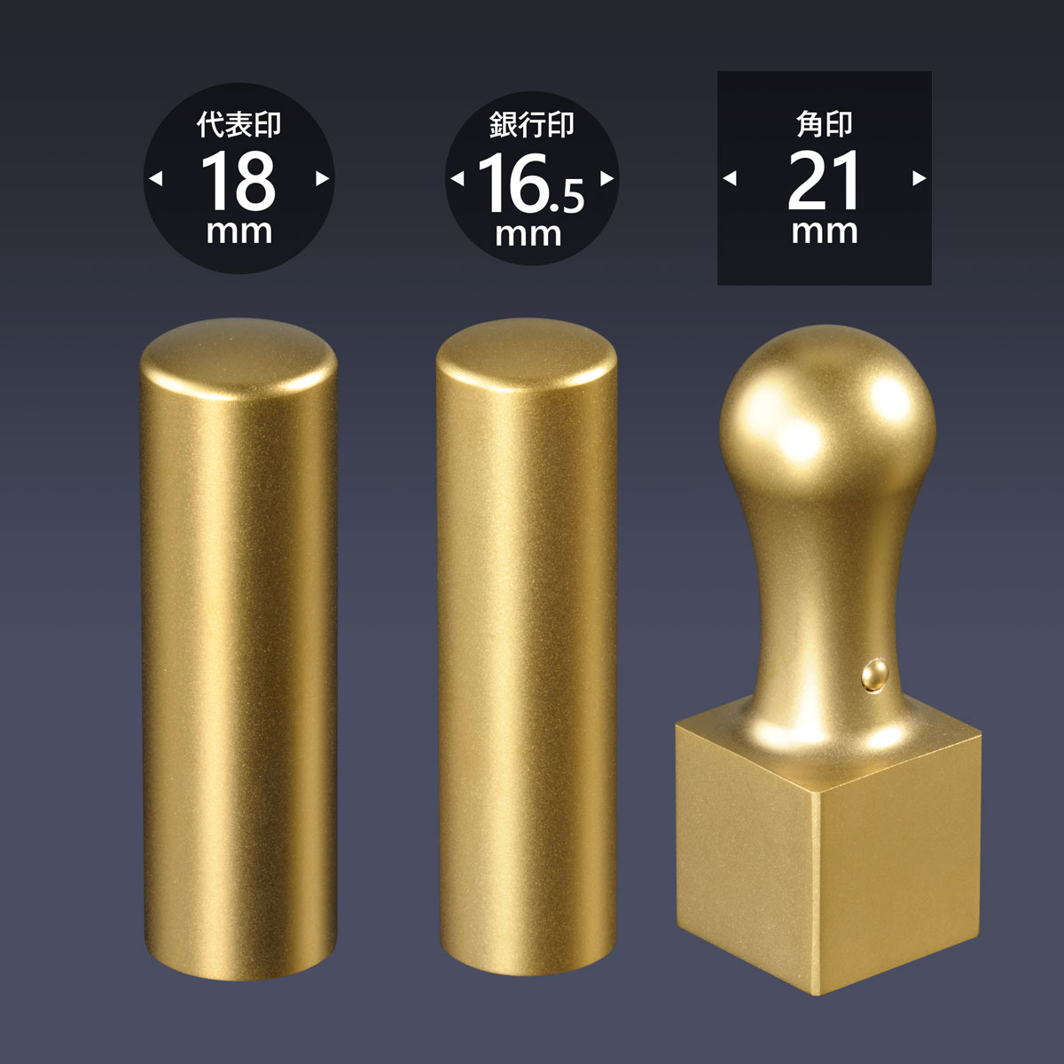 代表印丸寸胴18ミリ・銀行印丸寸胴16.5ミリ・角印角天丸21ミリの3本セットです。